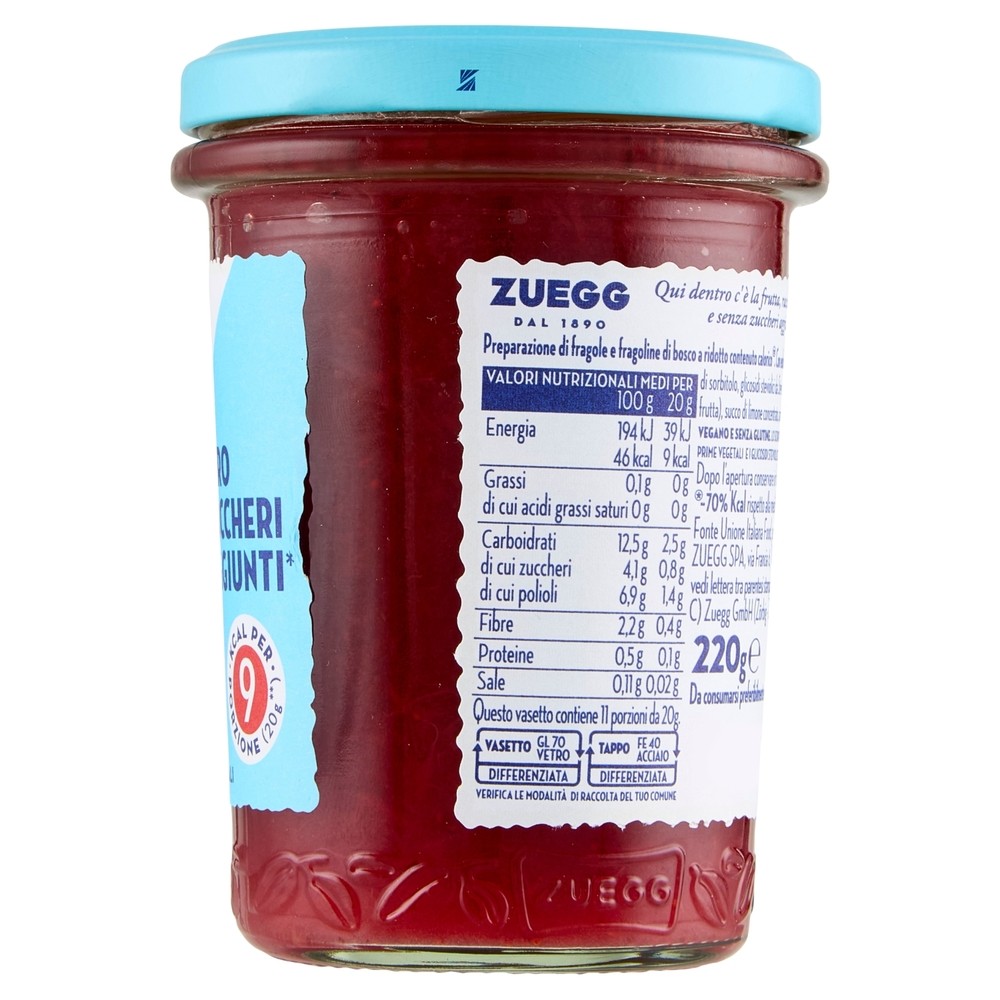 Насичений ягідний джем із полуниці та лісової суниці (fragole e fragoline di bosco) у серії Zero від Zuegg. Має яскравий аромат, приємну кислинку та густу текстуру — ідеально для сніданків та десертів.
