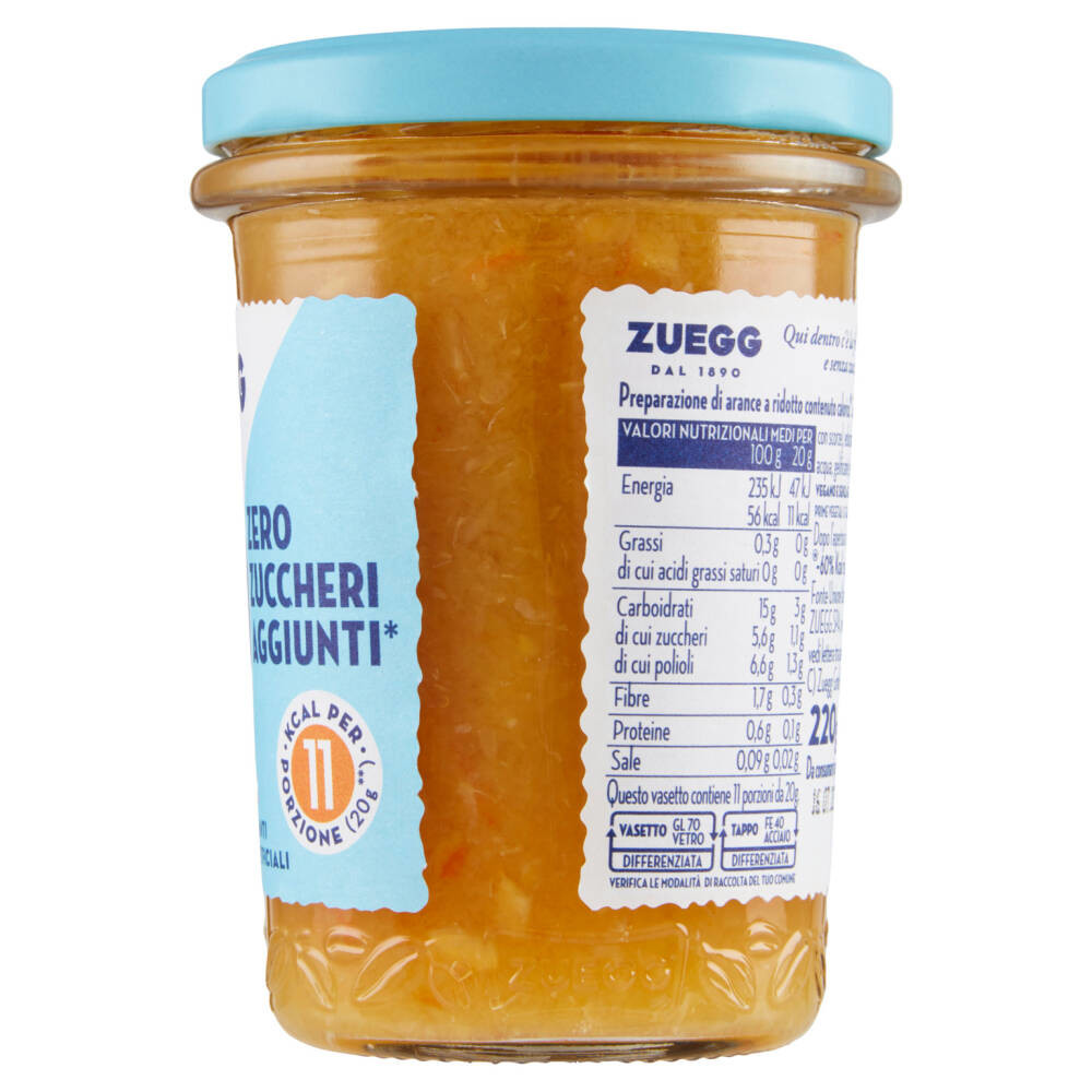 Zuegg Arance Zero — це ароматний апельсиновий джем із насиченим цитрусовим смаком без доданого цукру та без консервантів.