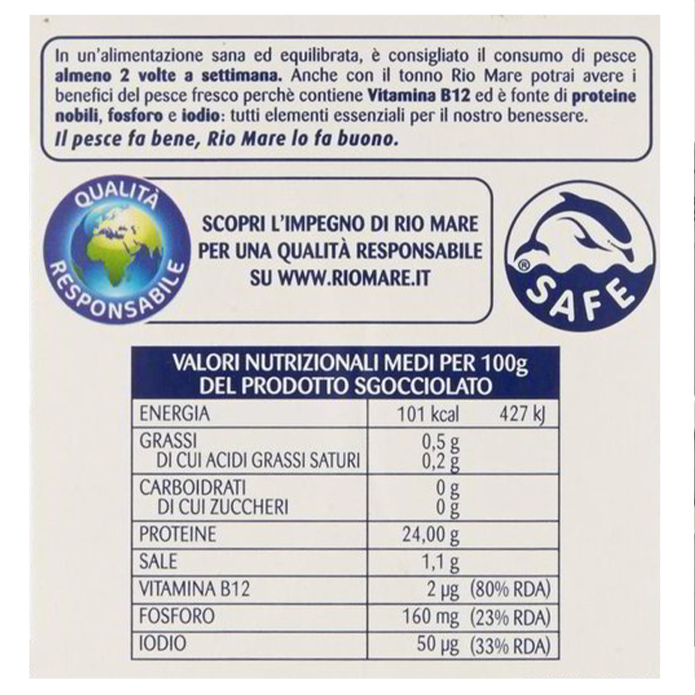 Тунец Rio Mare в собственном соку – это консервированный тунец, который хранится в собственном соке, без добавления масла и консервантов. Он известен своим нежным розовым цветом, натуральным вкусом и высоким качеством. Этот продукт является источником белка, витаминов и минералов, а также богат ненасыщенными жирными кислотами Омега-3 и Омега-6.Тунец Rio Mare в своем соке идеально подходит для тех, кто ценит легкие и полезные продукты, а также для приготовления различных блюд, таких как салаты, закуски, паста и другие.